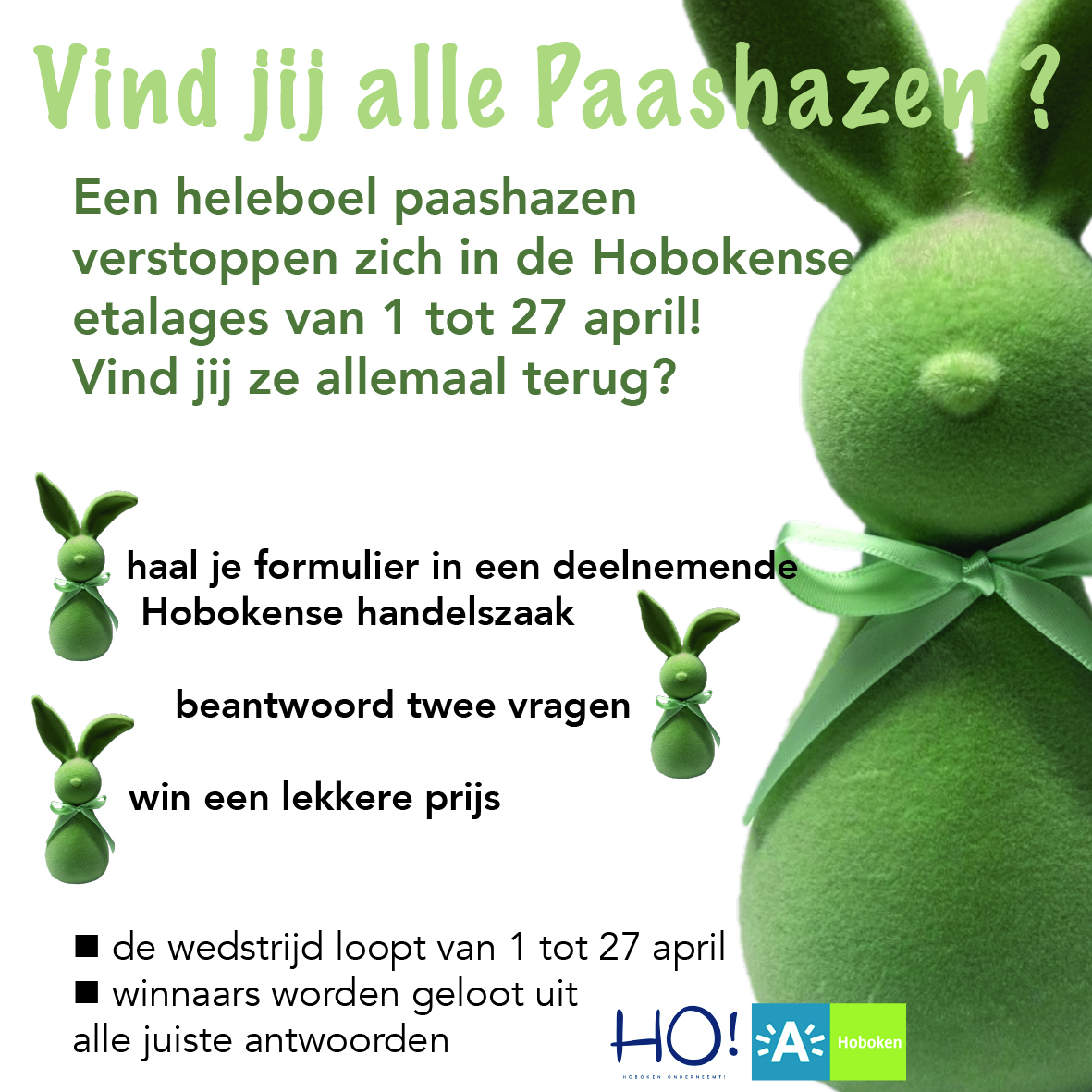 Een hele hoop paashazen verstopten zich in de Hobokense etalages. Vind jij ze allemaal? Haal een formulier bij een van de deelnemende handelaars, tel de hazen, en lever je formulier weer in voor 27 april. Misschien win jij wel een lekkere prijs!